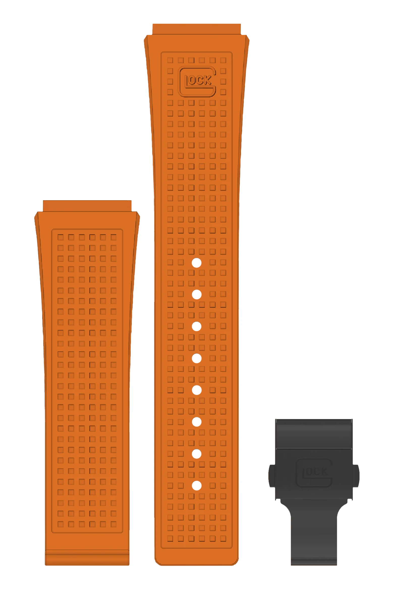 This silicone strap, adorned with the characteristic GLOCK RTF texture, combines durability with comfort. The orange strap is available in two sizes and is complemented by the black clasp. Match the last two digits of the item number for a GLOCK Watch and for a strap to ensure compatibility.