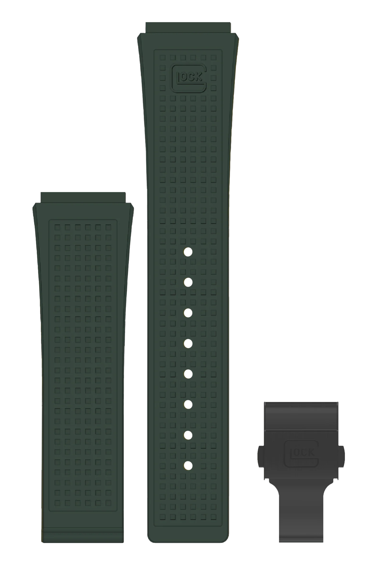 This silicone strap, adorned with the characteristic GLOCK RTF texture, combines durability with comfort. The racing green strap is available in two sizes and is complemented by the black clasp. Match the last two digits of the item number for a GLOCK Watch and for a strap to ensure compatibility.