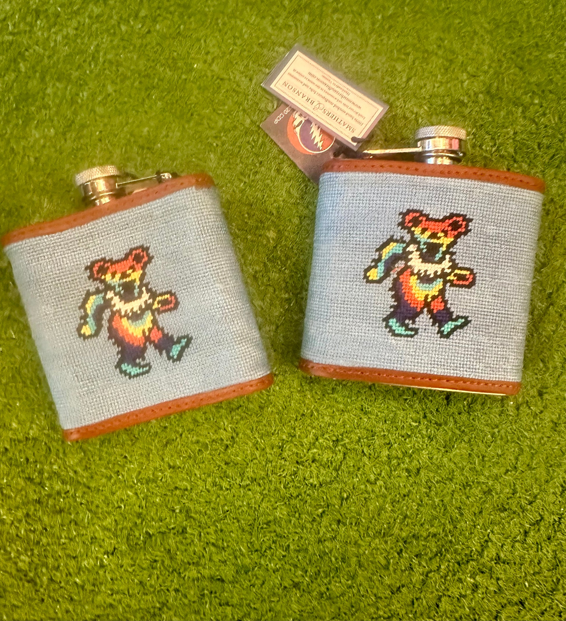 The Smathers and Branson 6oz stainless steel needlepoint flask is sure to get the party started (or keep it going) with style. Our signature needlepoint is trimmed with full grain Italian leather and is permanently fixed around the flask. There is not a better accessory for your back pocket wherever the party may take you. CHEERS!
