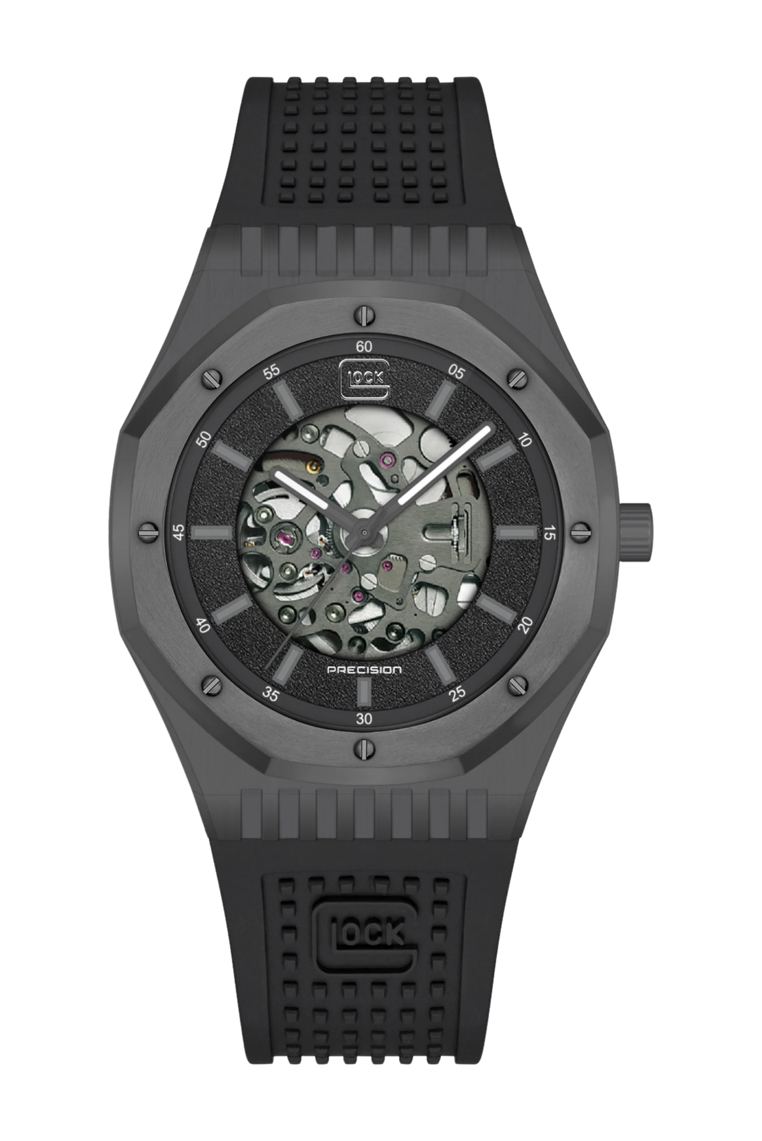 Sophisticated design meets technical precision in this striking automatic timepiece. The gunmetal-tone stainless steel case frames a black skeletonized dial that reveals the meticulously crafted gunmetal-toned movement beneath, reflecting the perfect balance of engineering and style. Gunmetal-tone hands with Swiss Super-LumiNova® ensure clear readability, while matching indices emphasize the watch’s cohesive and refined aesthetic. The black silicone strap, featuring GLOCK’s signature RTF texture, adds a modern, tactical edge while ensuring a secure and comfortable fit. With a water resistance of 10 ATM, this timepiece unites durability, elegance, and the unmistakable spirit of GLOCK design.