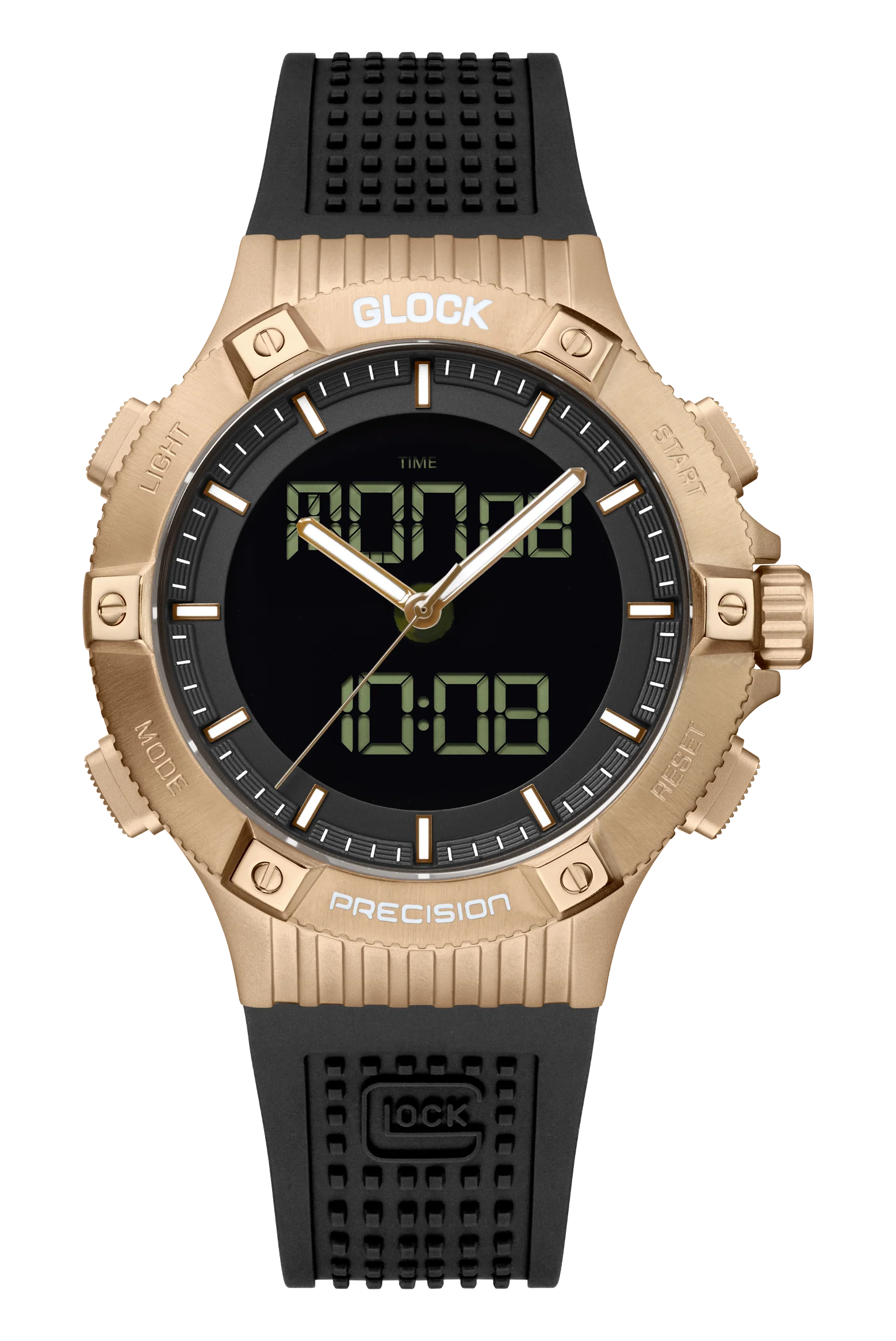 This timepiece represents modern elegance. Its sandblasted stainless steel case in coyote is paired with a black silicone strap featuring GLOCK's RTF structure. The combination of an analog and digital time display, complemented by Swiss Super-LumiNova® hands and indices, ensures a precise and quick check of the time. With a chronograph function and a 10 ATM water-resistance rating, it merges reliability with style.