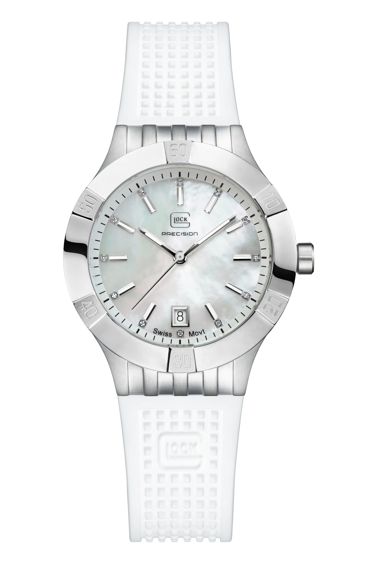 Crafted from brushed stainless steel, this watch pairs with a white silicone strap featuring GLOCK's signature RTF texture. The white mother-of-pearl dial showcases hands and indices with Swiss Super-LumiNova® and is adorned with twelve genuine diamonds, protected by scratch-resistant sapphire crystal. Powered by a precise Swiss movement and featuring a 10 ATM water-resistance rating, this watch balances functionality and style.