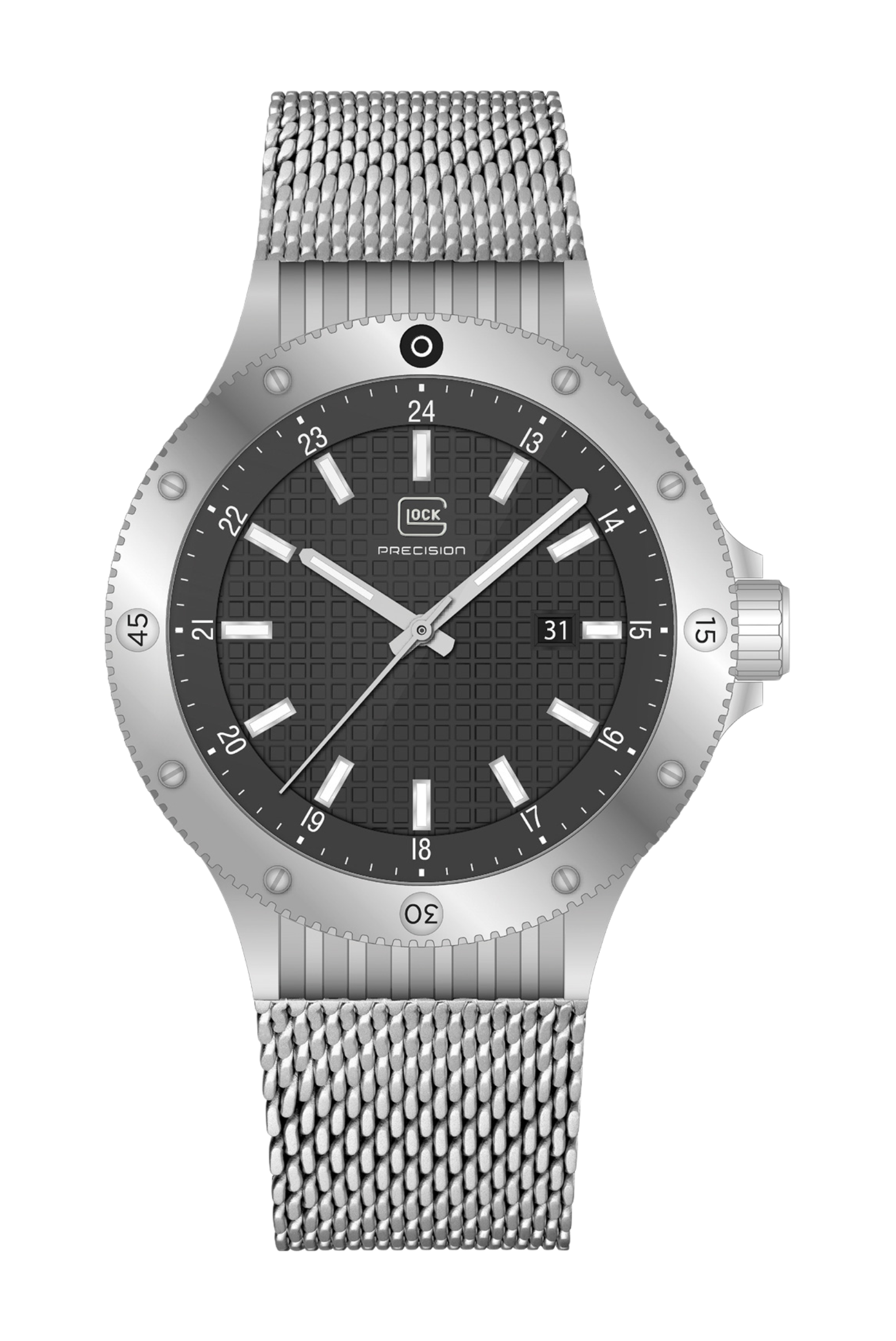 Timeless design meets technical precision in this refined timepiece. The silver-tone stainless steel case encases a black dial distinguished by GLOCK’s signature RTF structure, creating a subtle yet powerful contrast. Silver-tone hands and indices with Swiss Super-LumiNova® ensure exceptional legibility in all lighting conditions, reflecting the watch’s meticulous craftsmanship. The coordinated silver-tone mesh strap adds a touch of modern sophistication while providing a secure, comfortable fit. With a water resistance of 10 ATM, this watch blends durability, clarity, and elegance—crafted for those who appreciate precision in every detail.