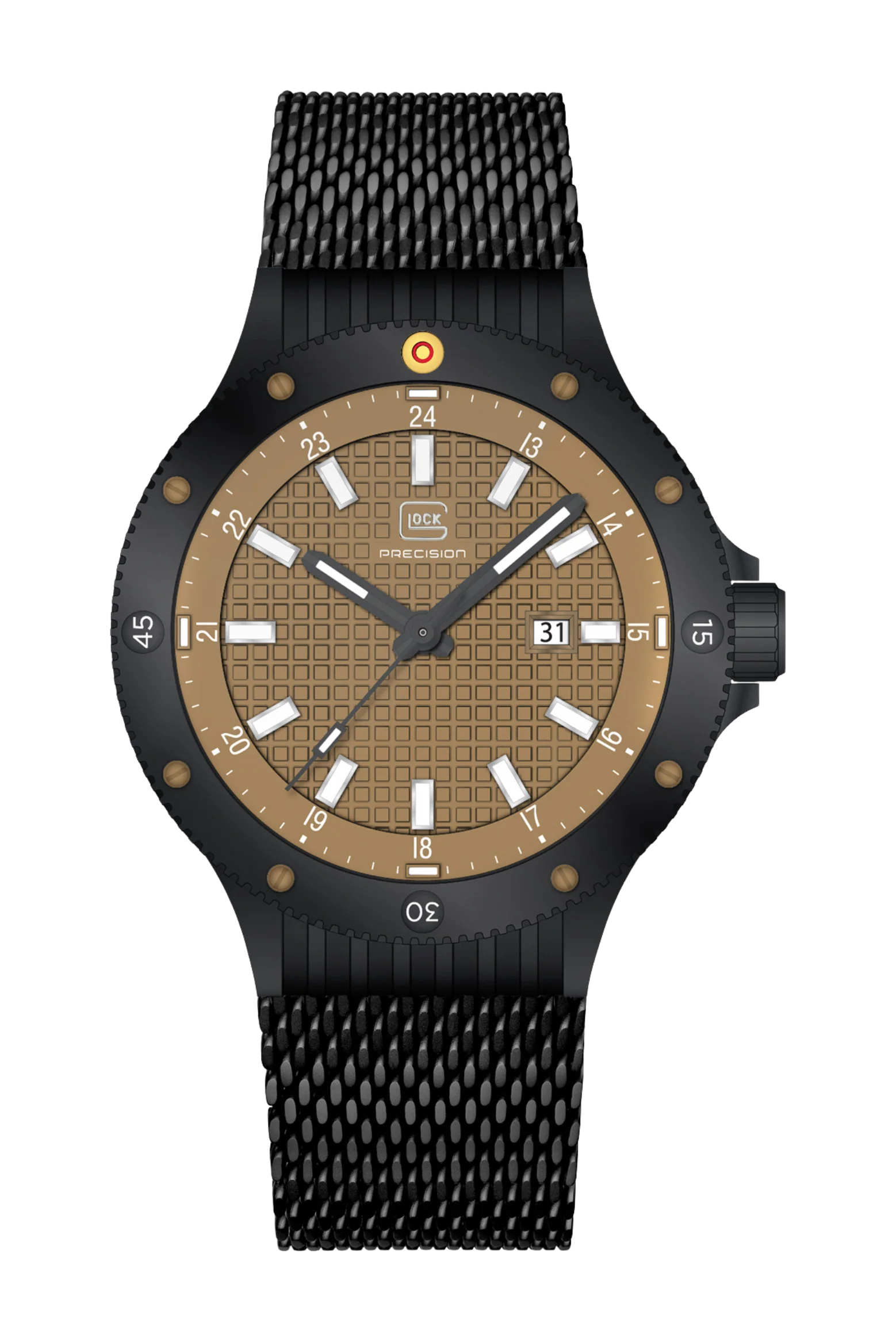 Bold character meets refined engineering in this exceptional timepiece. Encased in black stainless steel, the full coyote-tone dial with GLOCK’s signature RTF structure radiates tactical sophistication. Trigalights® integrated into the hands and at the 12, 3, 6, and 9-hour markers ensure constant readability, complemented by Swiss Super-LumiNova® for enhanced visibility in low light. A distinctive bullet detail on the bezel underscores the watch’s strong ballistic identity, while the black mesh strap provides a sleek, comfortable fit. Powered by a precise Swiss movement and water-resistant to 10 ATM, this watch embodies resilience, precision, and unmistakable GLOCK DNA.