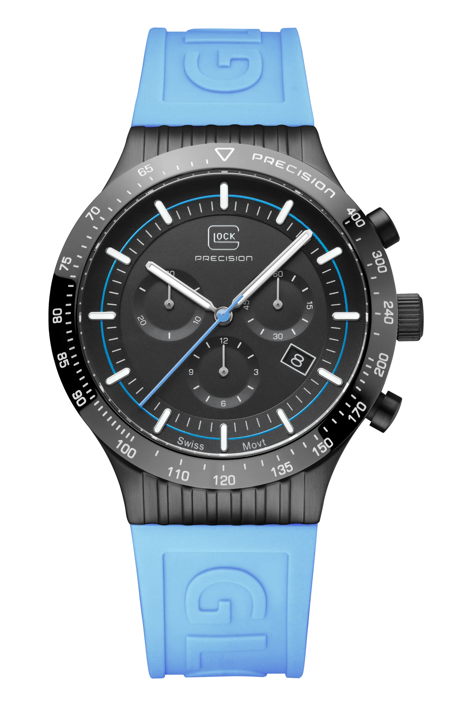 Encased in brushed black stainless steel, this watch boasts a blue silicone strap with GLOCK lettering. Powered by a Swiss movement, it guarantees timekeeping accuracy. Enhanced by a chronograph function, hands and indices with Swiss Super-LumiNova®, and a 20 ATM water-resistance rating, it represents precision, reliability, and style.