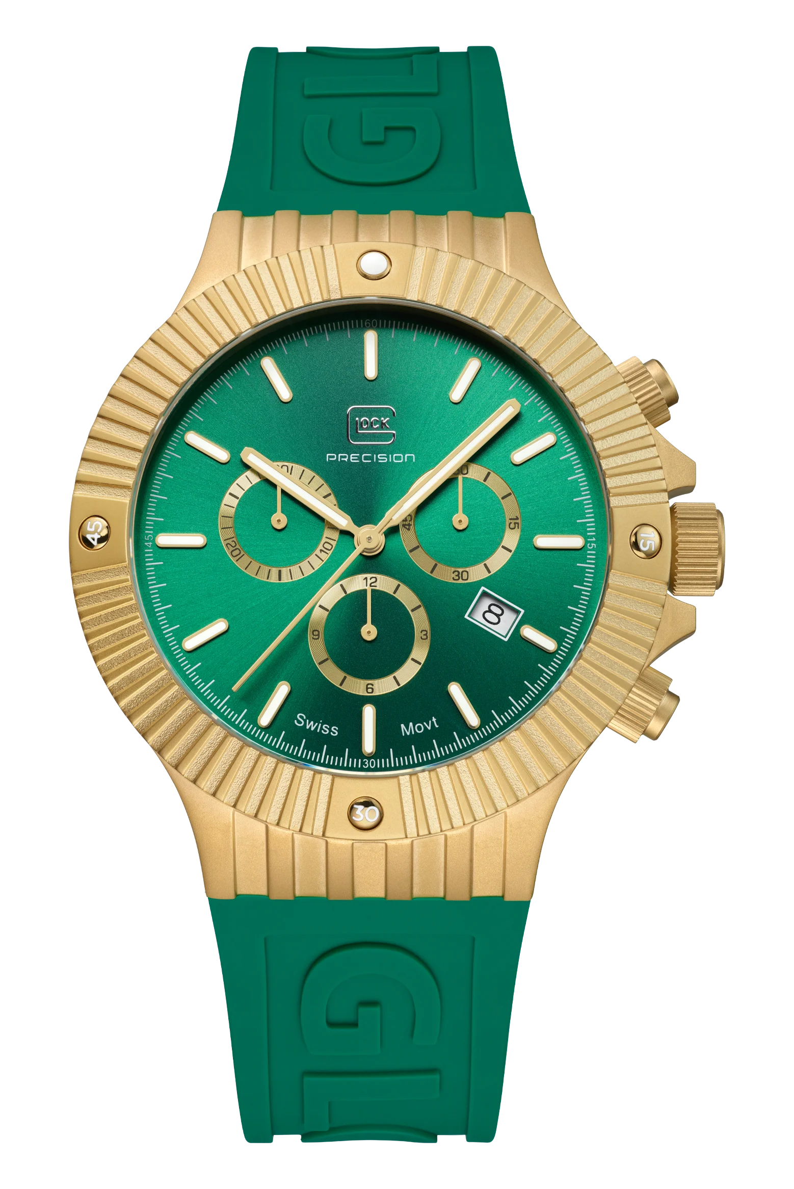 This watch captivates with its gold-tone stainless steel case and its striking interplay of colors. A green sunray dial under scratch-resistant sapphire crystal forms a harmonious blend with the athletic, green silicone strap featuring GLOCK lettering. Hands and indices with Swiss Super-LumiNova® ensure clear readability. Powered by a Swiss movement, this watch offers precision and reliability. Its chronograph function and 20 ATM water resistance combine impressive technical standards with a compelling design.