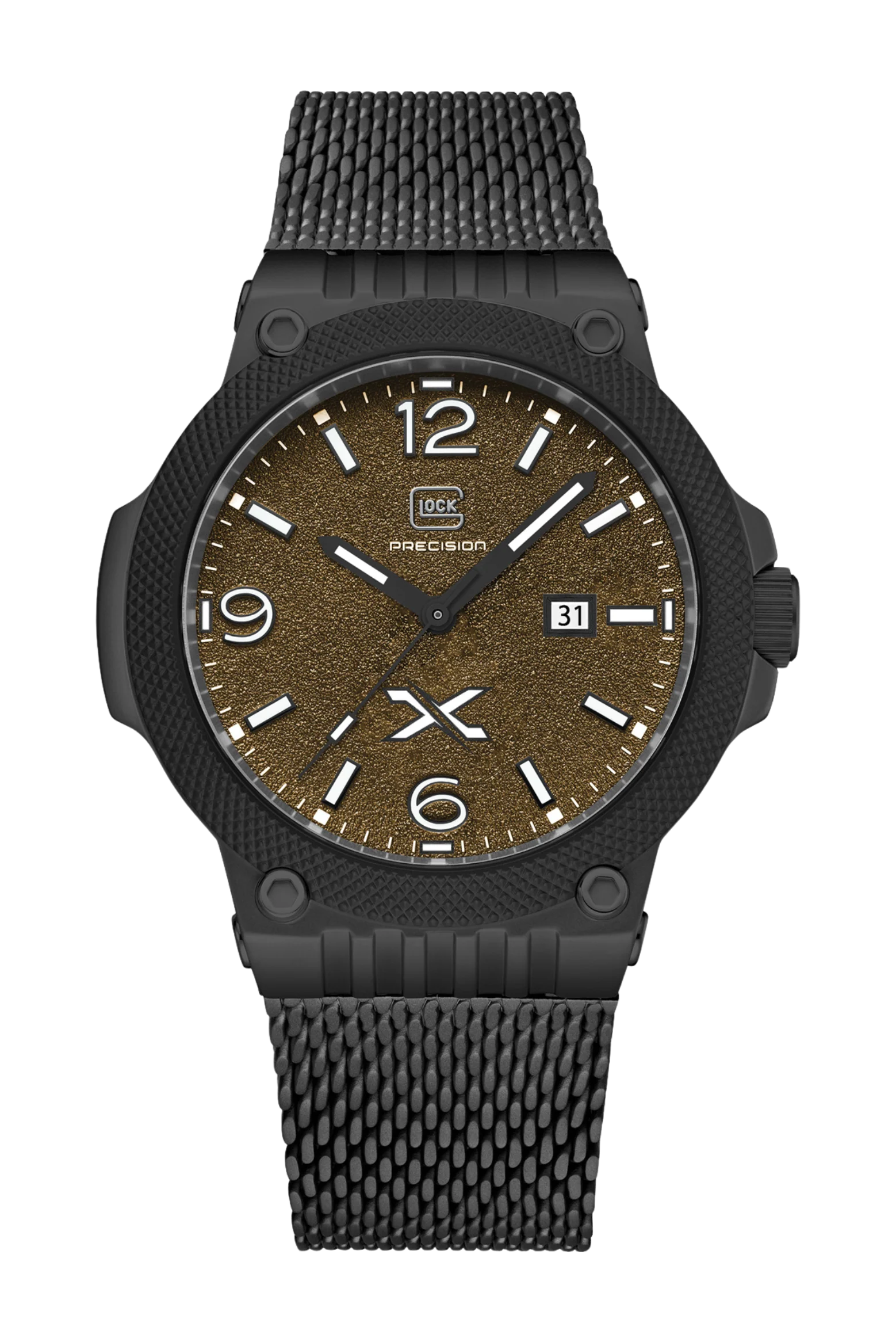 This Limited Edition timepiece merges contemporary design with GLOCK’s unmistakable DNA. The coyote-tone stainless steel case is paired with a black mesh strap, offering a sleek, modern presence. An additional khaki brown silicone strap provides a versatile option that complements the khaki brown sand-textured dial — marked by the distinctive GLOCK X emblem. Powered by a precise Swiss movement, this watch delivers reliable performance and enduring accuracy. A combination of Trigalights® and Swiss Super-LumiNova® ensures exceptional readability in any light condition. Framed by GLOCK’s iconic RTF-textured bezel and protected by scratch-resistant sapphire crystal, this Limited Edition model is water-resistant to 10 ATM — engineered for precision, resilience, and unmistakable GLOCK style, on duty or off the clock.