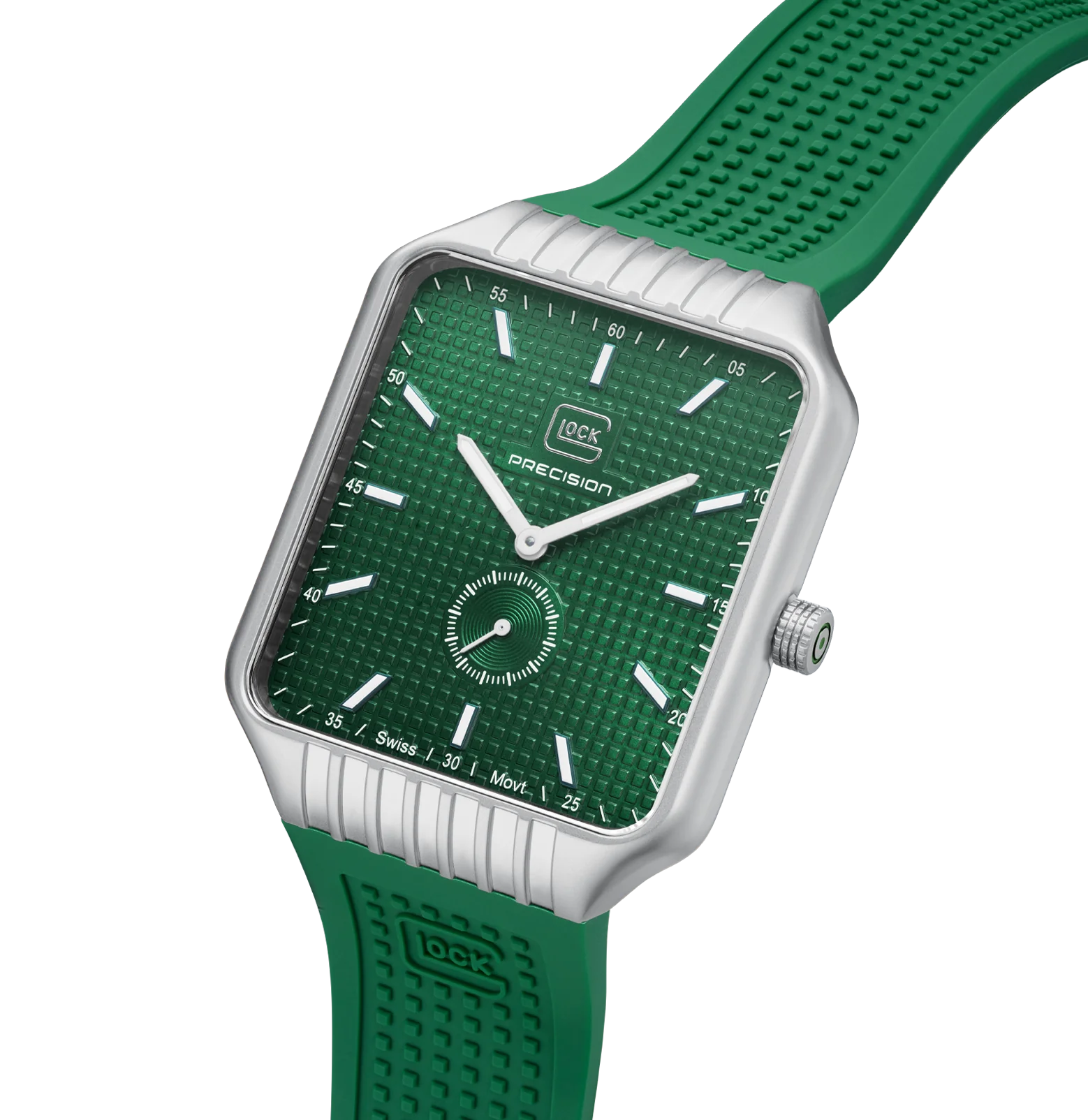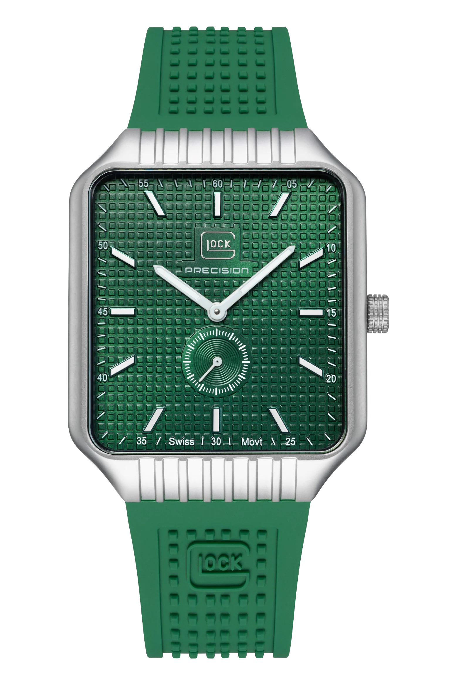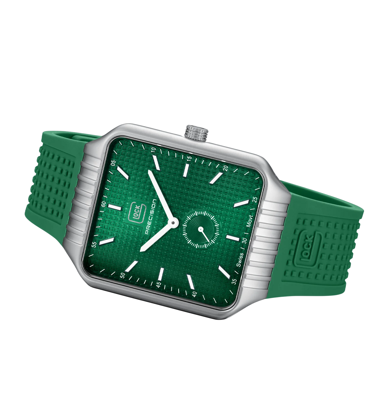 Precision takes center stage with this timepiece. Housed inside sandblasted stainless steel and shielded by sapphire crystal, its green dial is complemented by silver-tone hands and indices with Swiss Super-LumiNova®. The green silicone strap, featuring the GLOCK RTF structure, ensures a secure fit. With a 5 ATM water-resistance rating and dependable Swiss movement, it exemplifies robust functionality and accuracy. Thus, this watch is not only a timekeeping instrument, but also a reflection of dedication to precision, durability, and style.