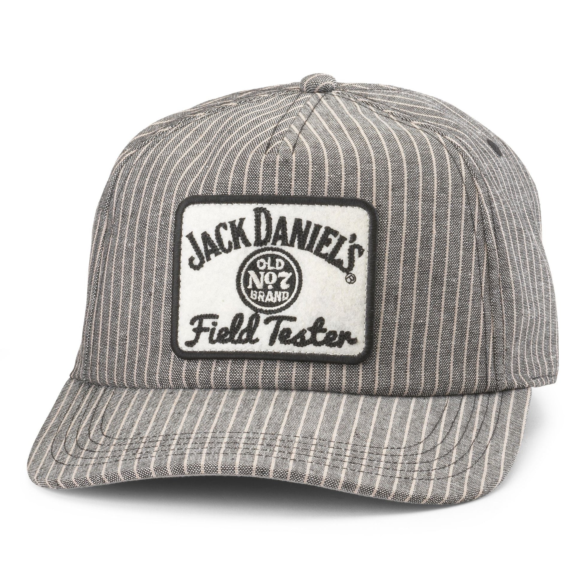 Soft 100% Cotton Pin Stripe 5-panel cap with soft structured crown. Slight curved visor with plastic snap closure. Front logo is soft felt merrowed patch with chain stitch embroidered details.