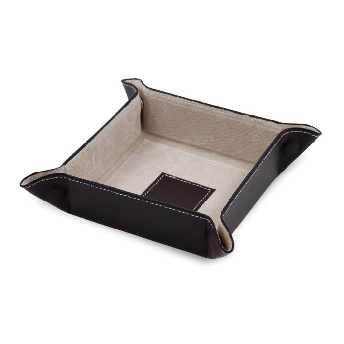 Keep your accessories readily accessible and neatly organized in our Victor black leather valet tray. This leather tray sits handsomely on any nightstand, desk, dresser, or counter. The valet has a Pig skin leather lining to prevent your belongings from scratching. The corner snaps give our valet a sleek and easy way to lay flat and travel with. The perfect gift for the person who has it all! Black Leather Snap Valet with Pig Skin Leather Lining.