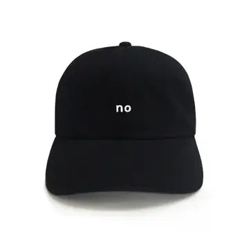 • Black 6-Panel Dad Hat • 100% Cotton • Adjustable strap • Embroidered "no" text • Ships worldwide